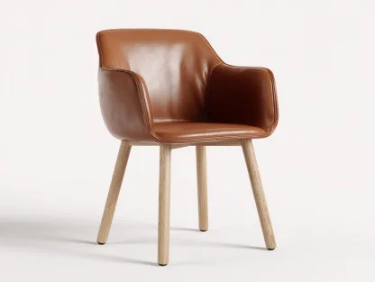 La silla cuenta con un asiento tapizado en cuero sintético de color marrón que proporciona una textura suave y fácil de mantener. Las patas están fabricadas en madera en color natural, ofreciendo estabilidad y un aspecto cálido que combina con diferentes estilos de interior.